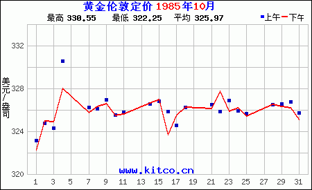 提供1985年10月的黄金价格查询,图表数据以美元/盎司黄金计价,黄金价格走势图仅供参考,本站对查询该历史金价数据导致的结果概不承担任何责任。
