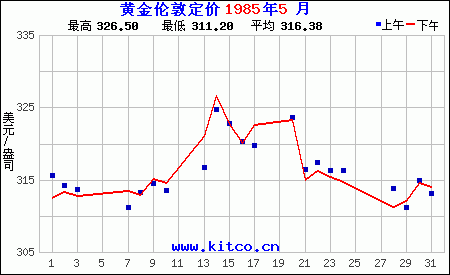 提供1985年5月的黄金价格查询,图表数据以美元/盎司黄金计价,黄金价格走势图仅供参考,本站对查询该历史金价数据导致的结果概不承担任何责任。