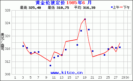 提供1985年6月的黄金价格查询,图表数据以美元/盎司黄金计价,黄金价格走势图仅供参考,本站对查询该历史金价数据导致的结果概不承担任何责任。