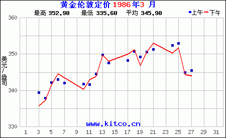 提供1986年3月的黄金价格查询,图表数据以美元/盎司黄金计价,黄金价格走势图仅供参考,本站对查询该历史金价数据导致的结果概不承担任何责任。