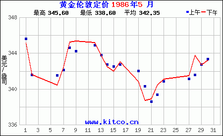 提供1986年5月的黄金价格查询,图表数据以美元/盎司黄金计价,黄金价格走势图仅供参考,本站对查询该历史金价数据导致的结果概不承担任何责任。