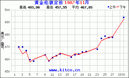 提供1987年11月的黄金价格查询,图表数据以美元/盎司黄金计价,黄金价格走势图仅供参考,本站对查询该历史金价数据导致的结果概不承担任何责任。