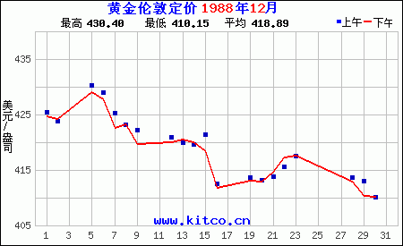 提供1988年12月的黄金价格查询,图表数据以美元/盎司黄金计价,黄金价格走势图仅供参考,本站对查询该历史金价数据导致的结果概不承担任何责任。