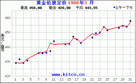 提供1988年3月的黄金价格查询,图表数据以美元/盎司黄金计价,黄金价格走势图仅供参考,本站对查询该历史金价数据导致的结果概不承担任何责任。