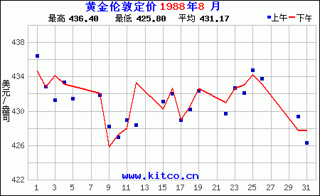 提供1988年8月的黄金价格查询,图表数据以美元/盎司黄金计价,黄金价格走势图仅供参考,本站对查询该历史金价数据导致的结果概不承担任何责任。