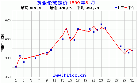 提供1990年8月的黄金价格查询,图表数据以美元/盎司黄金计价,黄金价格走势图仅供参考,本站对查询该历史金价数据导致的结果概不承担任何责任。