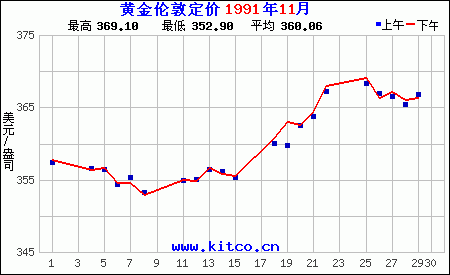 提供1991年11月的黄金价格查询,图表数据以美元/盎司黄金计价,黄金价格走势图仅供参考,本站对查询该历史金价数据导致的结果概不承担任何责任。