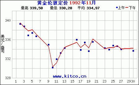 提供1992年11月的黄金价格查询,图表数据以美元/盎司黄金计价,黄金价格走势图仅供参考,本站对查询该历史金价数据导致的结果概不承担任何责任。