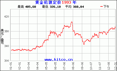 提供1993年黄金价格查询,数据以美元每盎司黄金计价,黄金价格走势图仅供参考,本站对查询该历史金价数据导致的结果概不承担任何责任。