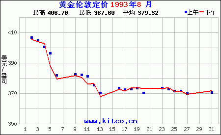 提供1993年8月的黄金价格查询,图表数据以美元/盎司黄金计价,黄金价格走势图仅供参考,本站对查询该历史金价数据导致的结果概不承担任何责任。