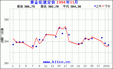 提供1994年11月的黄金价格查询,图表数据以美元/盎司黄金计价,黄金价格走势图仅供参考,本站对查询该历史金价数据导致的结果概不承担任何责任。