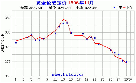提供1996年11月的黄金价格查询,图表数据以美元/盎司黄金计价,黄金价格走势图仅供参考,本站对查询该历史金价数据导致的结果概不承担任何责任。