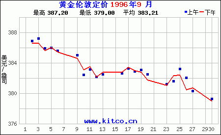 提供1996年9月的黄金价格查询,图表数据以美元/盎司黄金计价,黄金价格走势图仅供参考,本站对查询该历史金价数据导致的结果概不承担任何责任。