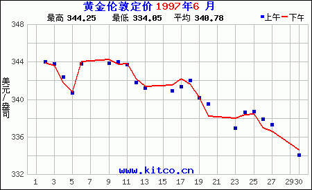 提供1997年6月的黄金价格查询,图表数据以美元/盎司黄金计价,黄金价格走势图仅供参考,本站对查询该历史金价数据导致的结果概不承担任何责任。