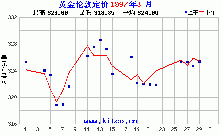 提供1997年8月的黄金价格查询,图表数据以美元/盎司黄金计价,黄金价格走势图仅供参考,本站对查询该历史金价数据导致的结果概不承担任何责任。