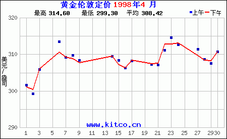 提供1998年4月的黄金价格查询,图表数据以美元/盎司黄金计价,黄金价格走势图仅供参考,本站对查询该历史金价数据导致的结果概不承担任何责任。