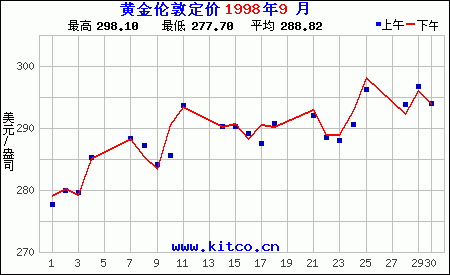 提供1998年9月的黄金价格查询,图表数据以美元/盎司黄金计价,黄金价格走势图仅供参考,本站对查询该历史金价数据导致的结果概不承担任何责任。