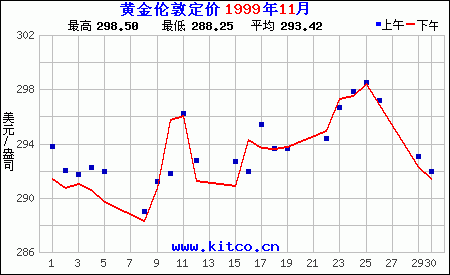 提供1999年11月的黄金价格查询,图表数据以美元/盎司黄金计价,黄金价格走势图仅供参考,本站对查询该历史金价数据导致的结果概不承担任何责任。