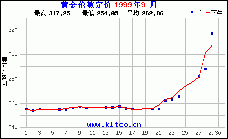 提供1999年9月的黄金价格查询,图表数据以美元/盎司黄金计价,黄金价格走势图仅供参考,本站对查询该历史金价数据导致的结果概不承担任何责任。