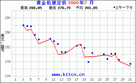 提供2000年7月的黄金价格查询,图表数据以美元/盎司黄金计价,黄金价格走势图仅供参考,本站对查询该历史金价数据导致的结果概不承担任何责任。
