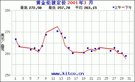 提供2001年3月的黄金价格查询,图表数据以美元/盎司黄金计价,黄金价格走势图仅供参考,本站对查询该历史金价数据导致的结果概不承担任何责任。