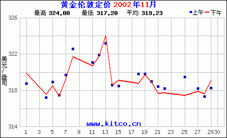 提供2002年11月的黄金价格查询,图表数据以美元/盎司黄金计价,黄金价格走势图仅供参考,本站对查询该历史金价数据导致的结果概不承担任何责任。
