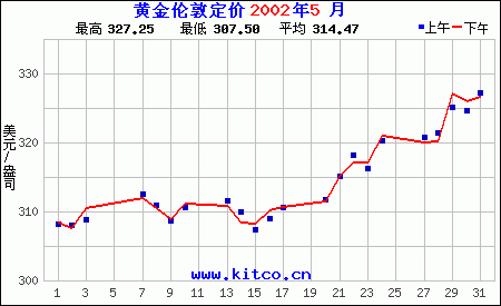 提供2002年5月的黄金价格查询,图表数据以美元/盎司黄金计价,黄金价格走势图仅供参考,本站对查询该历史金价数据导致的结果概不承担任何责任。