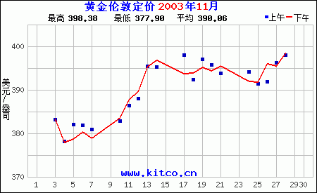 提供2003年11月的黄金价格查询,图表数据以美元/盎司黄金计价,黄金价格走势图仅供参考,本站对查询该历史金价数据导致的结果概不承担任何责任。
