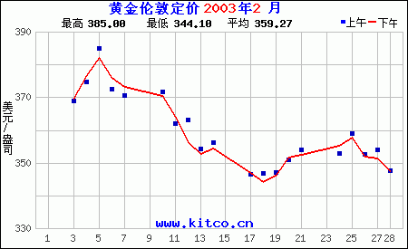 提供2003年2月的黄金价格查询,图表数据以美元/盎司黄金计价,黄金价格走势图仅供参考,本站对查询该历史金价数据导致的结果概不承担任何责任。