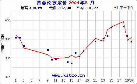 提供2004年6月的黄金价格查询,图表数据以美元/盎司黄金计价,黄金价格走势图仅供参考,本站对查询该历史金价数据导致的结果概不承担任何责任。