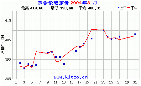 提供2004年8月的黄金价格查询,图表数据以美元/盎司黄金计价,黄金价格走势图仅供参考,本站对查询该历史金价数据导致的结果概不承担任何责任。