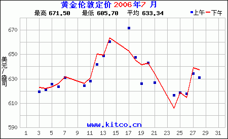 提供2006年7月的黄金价格查询,图表数据以美元/盎司黄金计价,黄金价格走势图仅供参考,本站对查询该历史金价数据导致的结果概不承担任何责任。