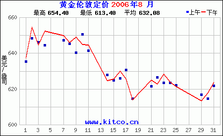 提供2006年8月的黄金价格查询,图表数据以美元/盎司黄金计价,黄金价格走势图仅供参考,本站对查询该历史金价数据导致的结果概不承担任何责任。