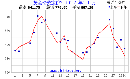 提供2007年11月的黄金价格查询,图表数据以美元/盎司黄金计价,黄金价格走势图仅供参考,本站对查询该历史金价数据导致的结果概不承担任何责任。