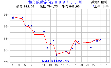 提供2008年8月的黄金价格查询,图表数据以美元/盎司黄金计价,黄金价格走势图仅供参考,本站对查询该历史金价数据导致的结果概不承担任何责任。