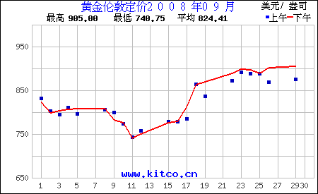 提供2008年9月的黄金价格查询,图表数据以美元/盎司黄金计价,黄金价格走势图仅供参考,本站对查询该历史金价数据导致的结果概不承担任何责任。