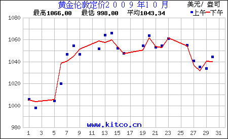 提供2009年10月的黄金价格查询,图表数据以美元/盎司黄金计价,黄金价格走势图仅供参考,本站对查询该历史金价数据导致的结果概不承担任何责任。