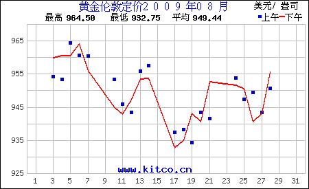 提供2009年8月的黄金价格查询,图表数据以美元/盎司黄金计价,黄金价格走势图仅供参考,本站对查询该历史金价数据导致的结果概不承担任何责任。