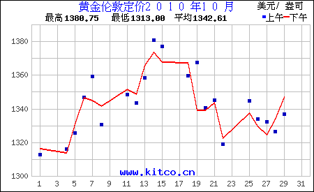 提供2010年10月的黄金价格查询,图表数据以美元/盎司黄金计价,黄金价格走势图仅供参考,本站对查询该历史金价数据导致的结果概不承担任何责任。