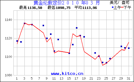 提供2010年3月的黄金价格查询,图表数据以美元/盎司黄金计价,黄金价格走势图仅供参考,本站对查询该历史金价数据导致的结果概不承担任何责任。
