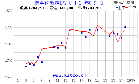 提供2012年9月的黄金价格查询,图表数据以美元/盎司黄金计价,黄金价格走势图仅供参考,本站对查询该历史金价数据导致的结果概不承担任何责任。