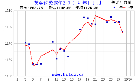提供2014年11月的黄金价格查询,图表数据以美元/盎司黄金计价,黄金价格走势图仅供参考,本站对查询该历史金价数据导致的结果概不承担任何责任。