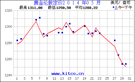 提供2014年5月的黄金价格查询,图表数据以美元/盎司黄金计价,黄金价格走势图仅供参考,本站对查询该历史金价数据导致的结果概不承担任何责任。
