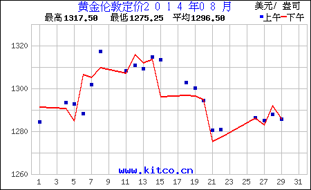 提供2014年8月的黄金价格查询,图表数据以美元/盎司黄金计价,黄金价格走势图仅供参考,本站对查询该历史金价数据导致的结果概不承担任何责任。