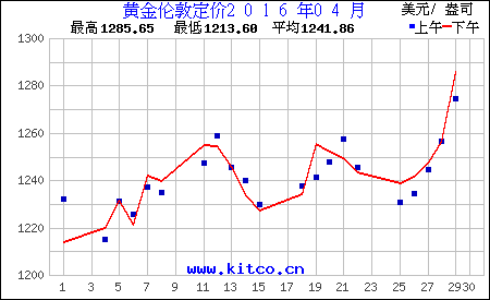 提供2016年4月的黄金价格查询,图表数据以美元/盎司黄金计价,黄金价格走势图仅供参考,本站对查询该历史金价数据导致的结果概不承担任何责任。