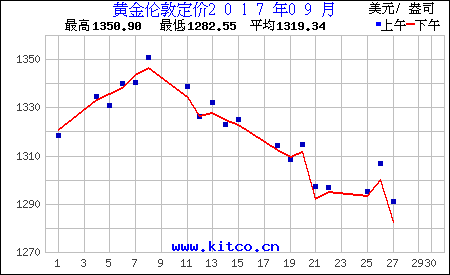提供2017年9月的黄金价格查询,图表数据以美元/盎司黄金计价,黄金价格走势图仅供参考,本站对查询该历史金价数据导致的结果概不承担任何责任。