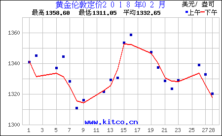 提供2018年2月的黄金价格查询,图表数据以美元/盎司黄金计价,黄金价格走势图仅供参考,本站对查询该历史金价数据导致的结果概不承担任何责任。
