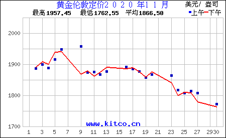 提供2020年11月的黄金价格查询,图表数据以美元/盎司黄金计价,黄金价格走势图仅供参考,本站对查询该历史金价数据导致的结果概不承担任何责任。
