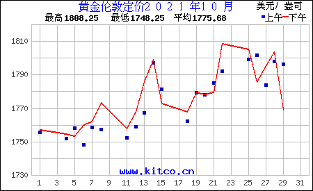 提供2021年10月的黄金价格查询,图表数据以美元/盎司黄金计价,黄金价格走势图仅供参考,本站对查询该历史金价数据导致的结果概不承担任何责任。